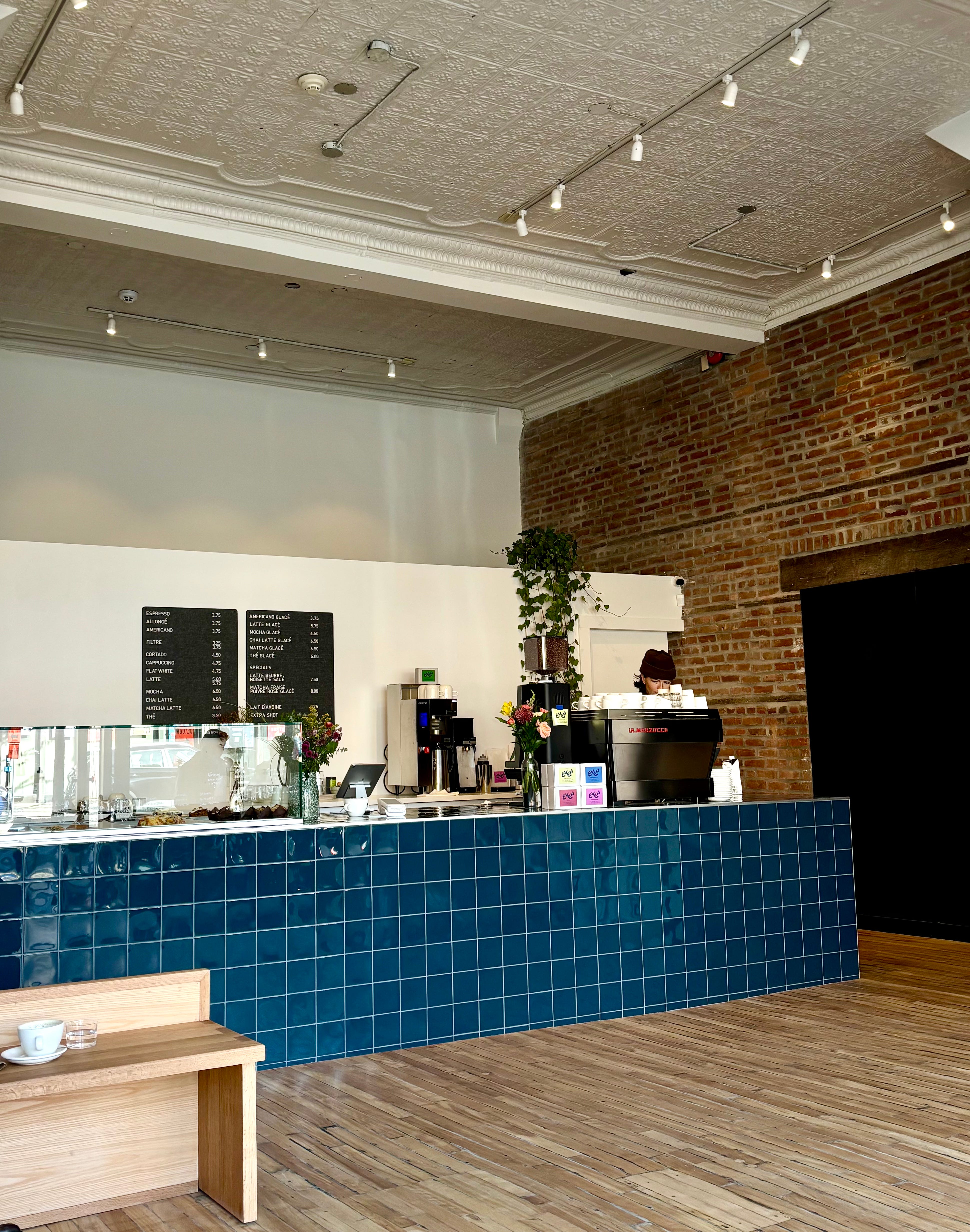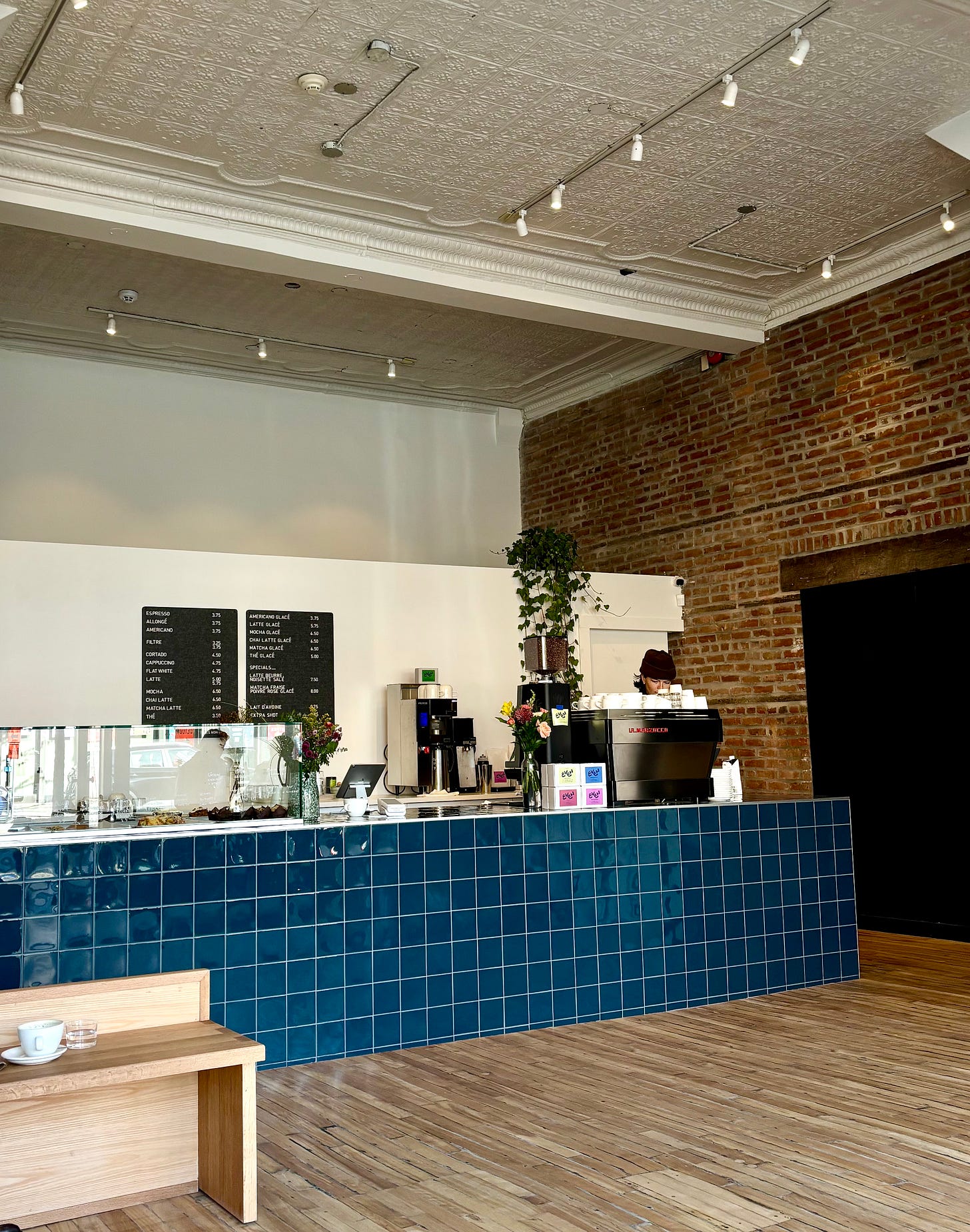 Au Jumeler, on ne retrouve ni tables ni prises électriques. Ce que je devine être une astuce pour encourager les échanges et les discussions entre les gens plutôt que d’en faire un café de télétravailleurs. De jolis et minimalistes bancs en bois bordent les fenêtres et forment un demi-rectangle. Les différentes teintes de bleu sont la couleur dominante de ce charmant espace.