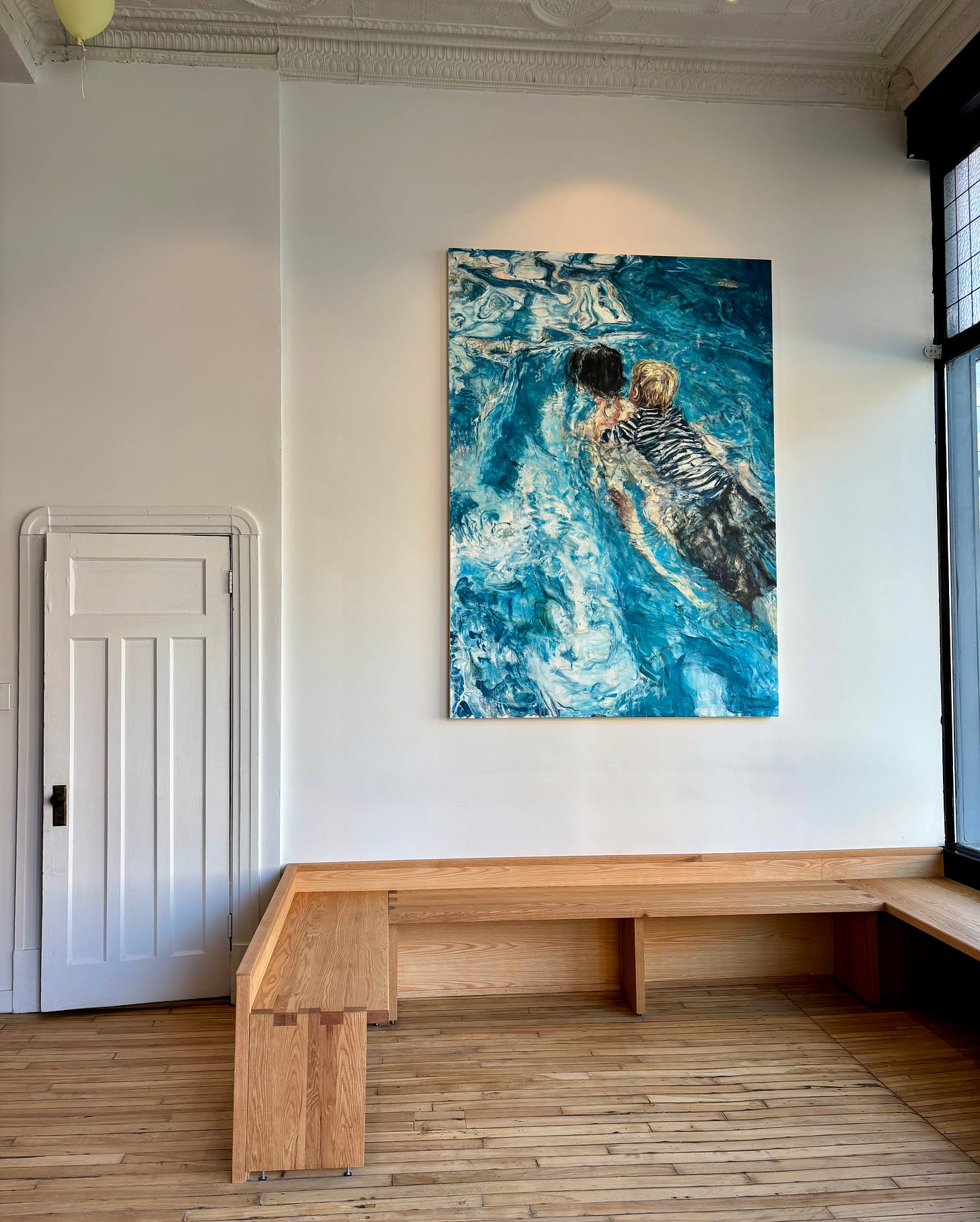 L’unique pièce de décoration au mur est une immense toile à l’huile représentant une scène simple de deux enfants qui se baignent dans l’eau. Les couleurs sont magnifiques et viennent parfaitement habiller l’espace. Cette oeuvre d’art est un coup de coeur pour moi.