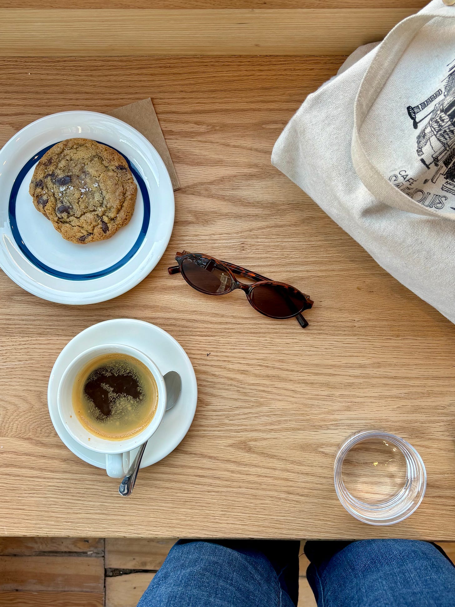 C’est le moment du mois où j’ai la dent plus sucrée, alors j’ai décidé d’accompagner mon café d’un biscuit chocolat noir et beurre noisette. Sur leur grand comptoir aux belles tuiles, on retrouve une petite sélection de viennoiseries maison : biscuits, scones et muffins. Mon biscuit est très bon, belle texture, et le contraste du chocolat noir avec la fleur de sel sur le dessus est toujours un duo gagnant.