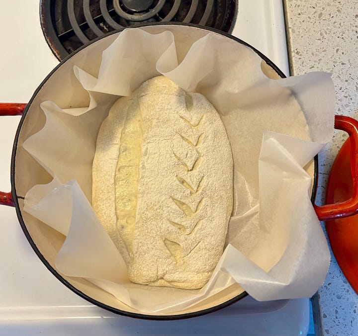 Après ces petites séances de pétrissage, couvrir la pâte d’un linge humide et laisser reposer au moins 7 heures, mais honnêtement, 9 heures donnent des résultats optimaux. Parfois je prépare la pâte le soir avant de me coucher pour pouvoir enfourner le lendemain matin; d’autres fois, je la fais dès mon réveil pour la cuire le soir. Les deux options fonctionnent à merveille.