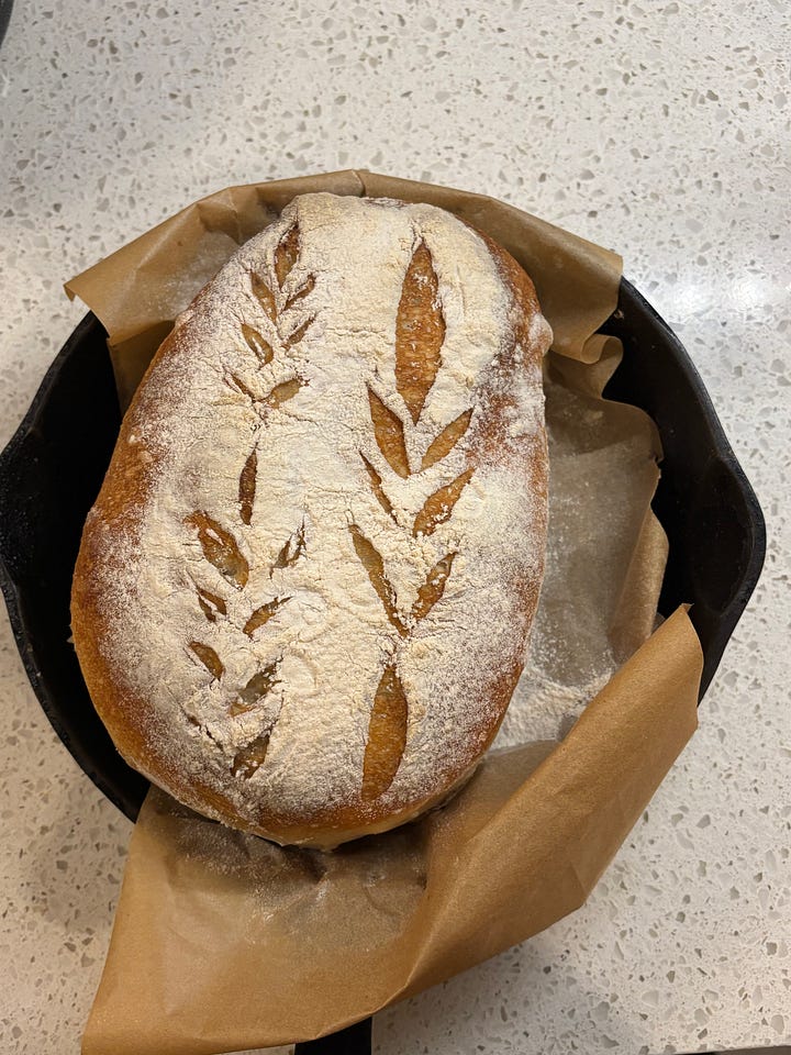 Une fois que la miche sort du four, j’ai toujours cette petite fierté douce qui me traverse. Pas une fierté voyante, juste un « ahhh » satisfaisant. Le craquement de la croûte, la vapeur qui s’échappe en filets minces quand je coupe la première tranche, la mie encore chaude… et moi qui crie à Oliver : « viens voir mon pain, il est trop beau !!! » Même si c’est ma quinzième miche. Et chaque fois, il est très impressionné hihi.