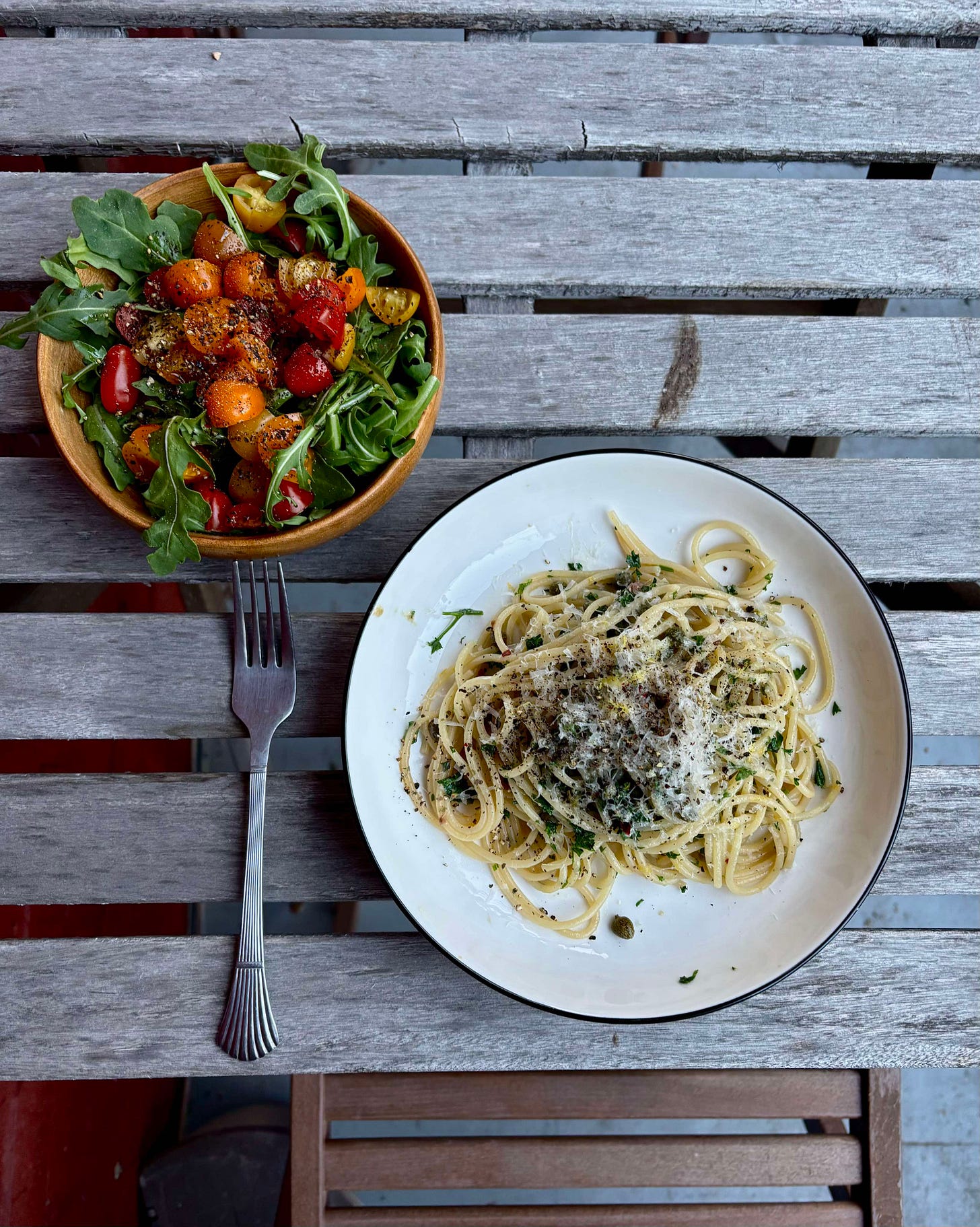 Un repas de printemps tout en simplicité : spaghettis aux anchois et aux câpres avec une salade de roquette. Hmmm, miam, c’était tellement bon de manger dehors. J’ai hâte à plus de ça.