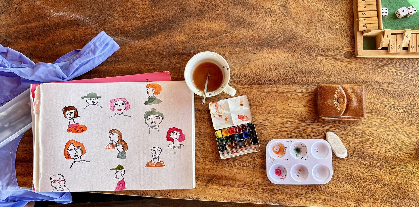 Je prends mon café noir en lisant mon livre ou en dessinant, puis je rejoins mes nouveaux amis pour le déjeuner aux tables communes.