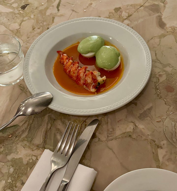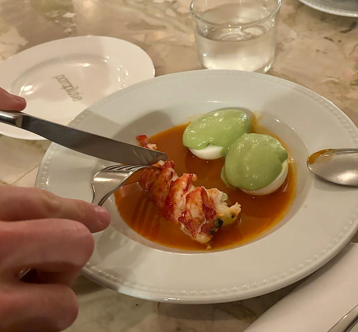 Nous avons entamé notre dégustation avec un classique de leur menu : les œufs mayonnaise avec homard et estragon accompagnée d’une délicieuse bisque. C’était dodu, fondant, savoureux - et la meilleure partie était sans doute la mouillette de pain au levain trempée dans la bisque chaude. Savoureux du début à la fin.
